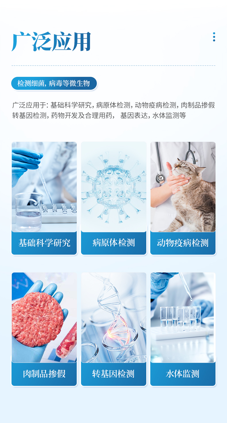 儀器采用通用100uLPCR反應管,降低耗材成本且易于獲得。廣泛應用于:基礎科學研究,病原體檢測,動物疫病檢測,肉制品摻假,轉基因檢測,藥物開發(fā)及合理用藥, 基因表達,水體監(jiān)測等