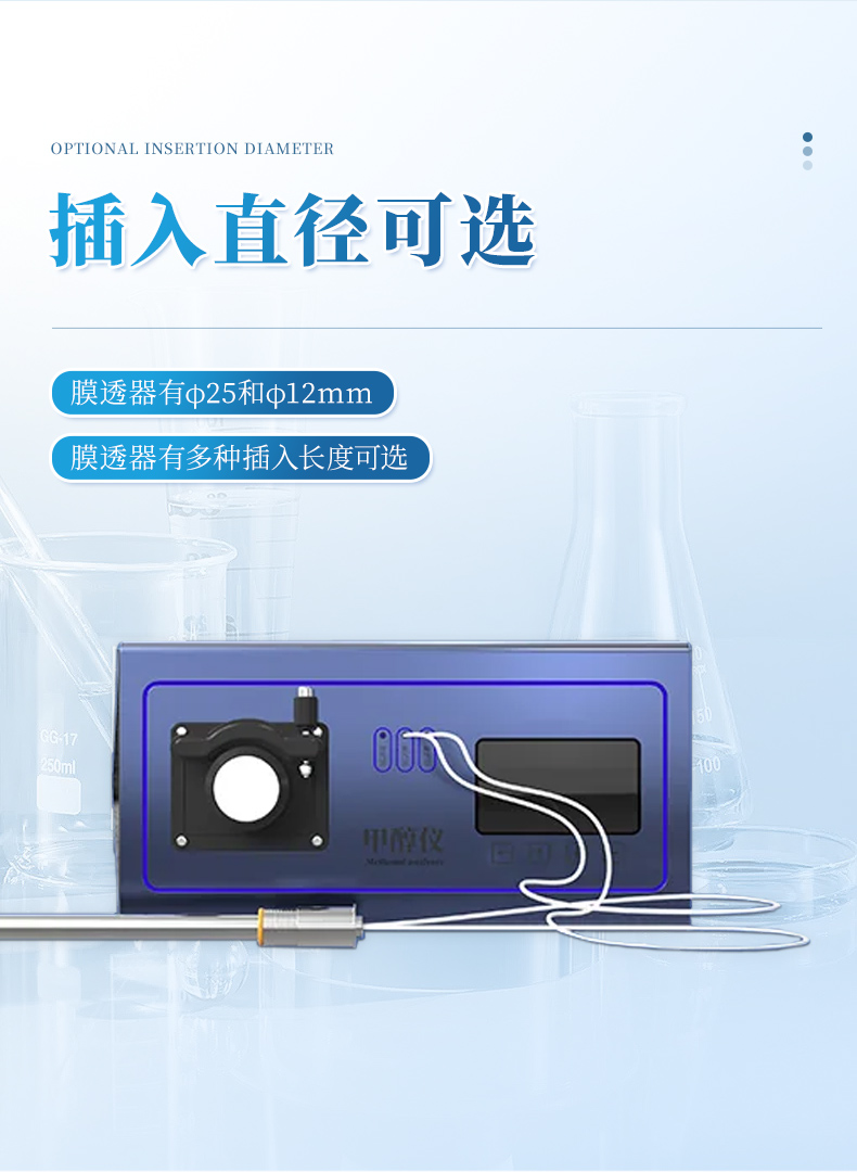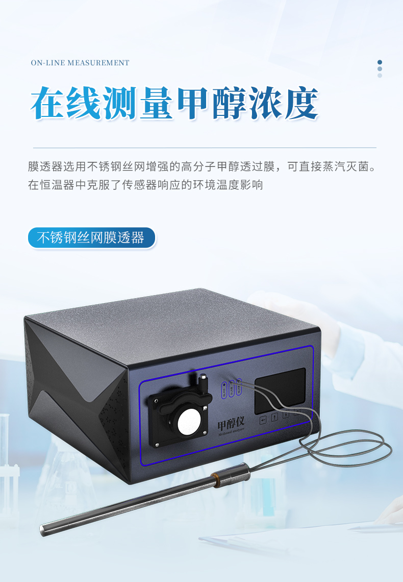 在線測(cè)量發(fā)酵液中甲醇濃度,膜透器選用了不銹鋼絲網(wǎng)增強(qiáng)的高分子甲醇透過(guò)膜,可直接蒸汽滅菌。檢測(cè)傳感器工作在恒溫器中克服了傳感器響應(yīng) 的環(huán)境溫度影響,脫透器有φ25和φ12mm插入直徑可選,和有多種插入長(zhǎng) 度可選,儀器具有非線性校正,程控標(biāo)定,高低位報(bào)警,數(shù)字溫度補(bǔ)償和兩級(jí)密碼保護(hù)重要數(shù)據(jù)及菜單組態(tài)等功能