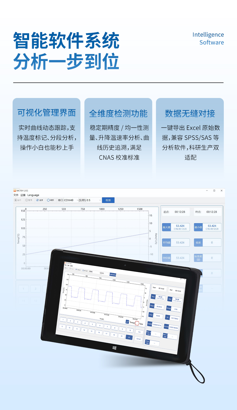 3.20通道/0.5S的高速溫度采集速度,適應(yīng)大部分10℃/S以下的管內(nèi)升降溫實(shí)時(shí)數(shù)據(jù)采集,不損失有效溫度數(shù)據(jù)