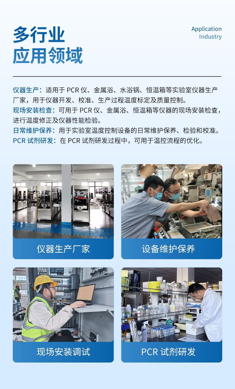1) PCR儀,金屬浴,水浴鍋,恒溫箱等實(shí)驗(yàn)室儀器生產(chǎn)廠家,用于儀器開發(fā),校準(zhǔn),生產(chǎn)過程溫度標(biāo)定及質(zhì)量控制