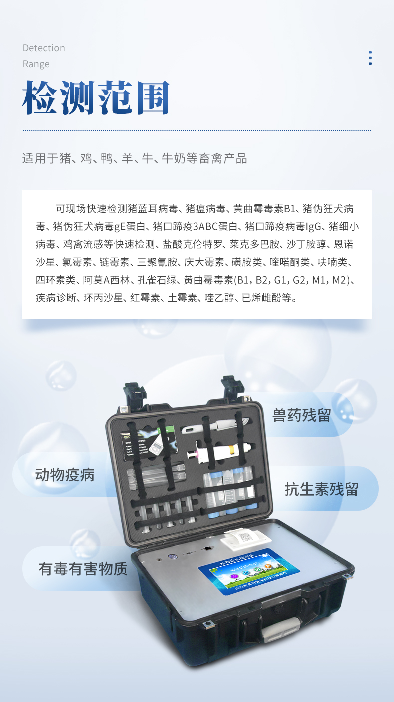動物疫病診斷儀可現(xiàn)場快速檢測豬藍(lán)耳病毒、豬瘟病毒、黃曲霉毒素B1、豬偽狂犬病毒、豬偽狂犬病毒gE蛋白、豬口蹄疫3ABC蛋白、豬口蹄疫病毒IgG、豬細(xì)小病毒、雞禽流感等快速檢測、鹽酸克倫特羅、萊克多巴胺、沙丁胺醇、恩諾沙星、氯霉素、鏈霉素、三聚氰胺、慶大霉素、磺胺類、喹喏酮類、呋喃類、四環(huán)素類、阿莫西林、孔雀石綠、黃曲霉毒素(B1,B2,G1,G2,M1,M2 )、疾病診斷、環(huán)丙沙星、紅霉素、土霉素、喹乙醇、已烯雌酚等項目的定性檢測。
