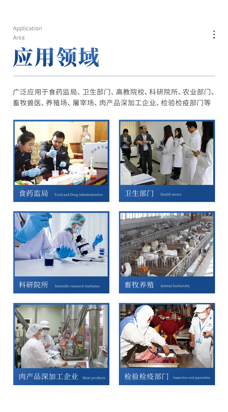 該動物疫病診斷儀適用于豬、雞、鴨、羊、牛、牛奶等畜禽產(chǎn)品中動物疫病、獸藥殘留、有毒有害物質(zhì)和抗生素殘留的檢測可廣泛應(yīng)用于食藥監(jiān)局、衛(wèi)生部門、高教院校、科研院所、農(nóng)業(yè)部門、畜牧獸醫(yī)、養(yǎng)殖場、屠宰場、食品肉產(chǎn)品深加工企業(yè)、檢驗檢疫部門等單位使用。