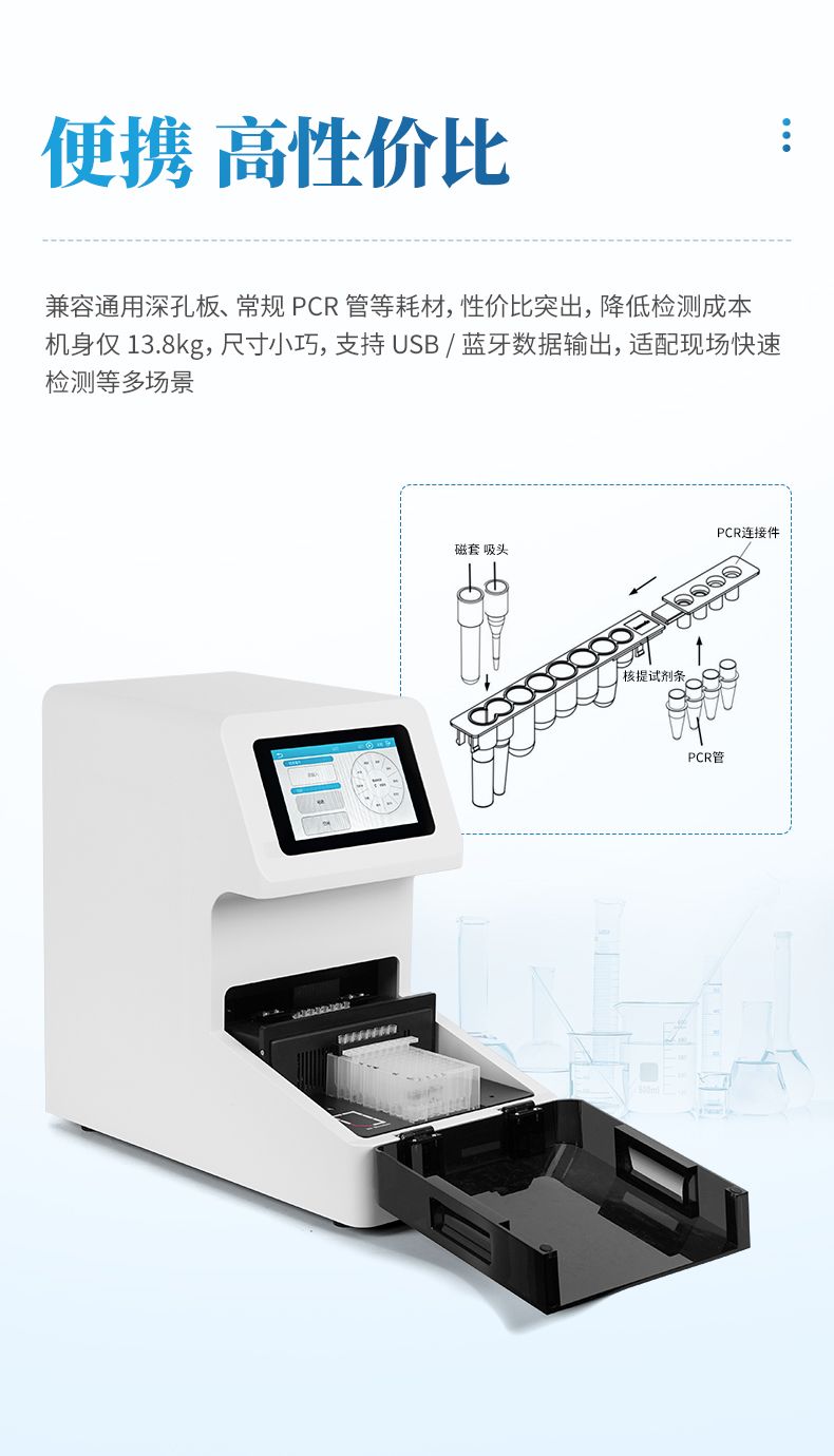 實(shí)現(xiàn)“樣本進(jìn)-結(jié)果出”的全自動(dòng)流程。PCR擴(kuò)增在密閉的環(huán)境中進(jìn)行核酸的擴(kuò)增和檢測(cè),可避免氣溶膠污染。儀器為開放系統(tǒng),可適配市面上常見的試劑體系,應(yīng)用場(chǎng)景廣泛,如動(dòng)植物疫病檢測(cè),現(xiàn)場(chǎng)快速檢測(cè)等。
