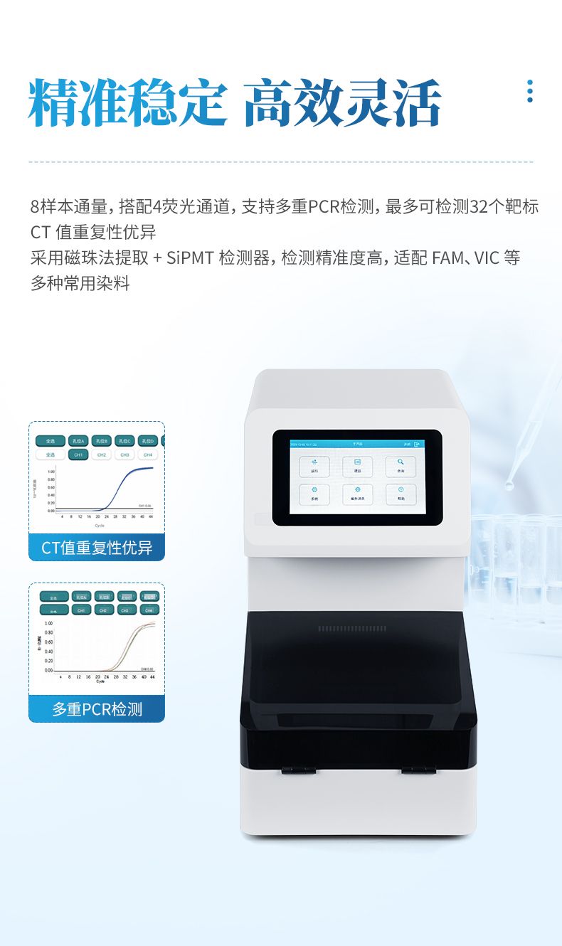 全自動(dòng)核酸檢測(cè)設(shè)備是一款集核酸提取、 PCR擴(kuò)增以及熒光檢測(cè)于一體。儀器配合通用磁珠法核酸提取試劑和熒光定量PCR試劑,一次實(shí)驗(yàn)可支持8個(gè)樣本的QPCR檢測(cè)。用戶只需加入樣本,無需轉(zhuǎn)管,配液等復(fù)雜操作,可大大降低人工操作,