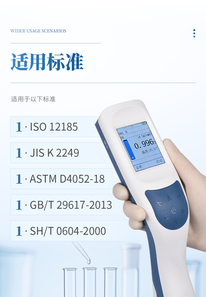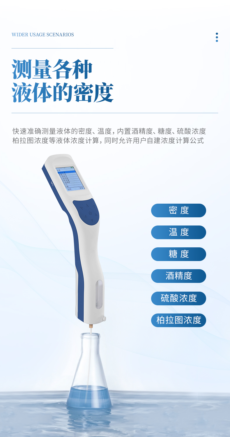 手持密度計(jì)是利用U型管振蕩原理,通過測量樣品的共振頻率來測定各種液體樣品的密度。它具有操作簡便、測量準(zhǔn)確等特點(diǎn),適用于各種液體的密度測量。
