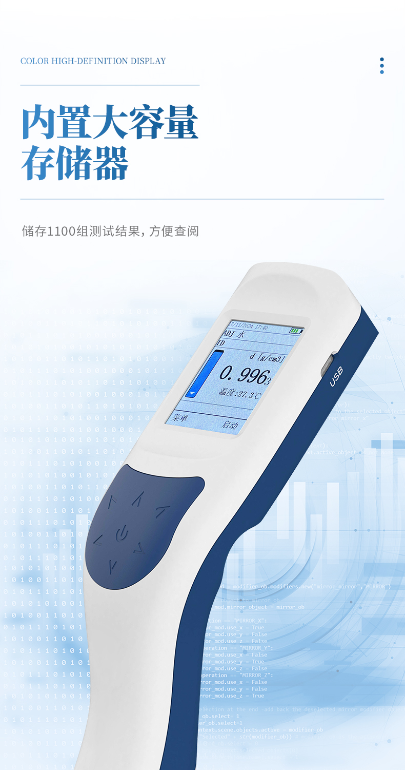 儀器采用2.4寸彩色高清顯示器,人體工程學(xué)握持結(jié)構(gòu),便于單手進(jìn)行測量操作。內(nèi)置大容量存儲器,可以存儲千條以上歷史數(shù)據(jù),通過USB可以將數(shù)據(jù)導(dǎo)入U(xiǎn)盤或者電腦,連接藍(lán)牙打印機(jī)可以立刻對測量結(jié)果進(jìn)行無線打印。